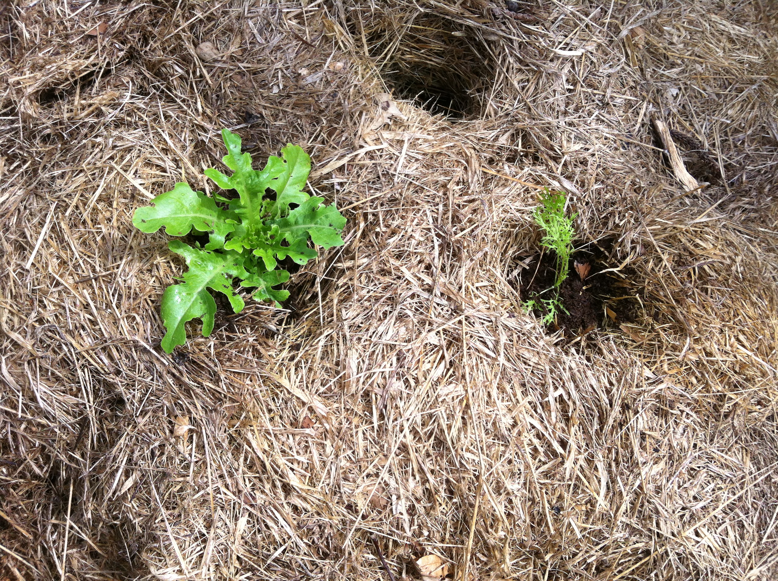 I then gently added the lettuce plant and put some more compost around the plant, gently pressing it down so the plant was stable. After I had filled all the holes I covered any exposed soil with the mulch I had pushed aside to make the holes.